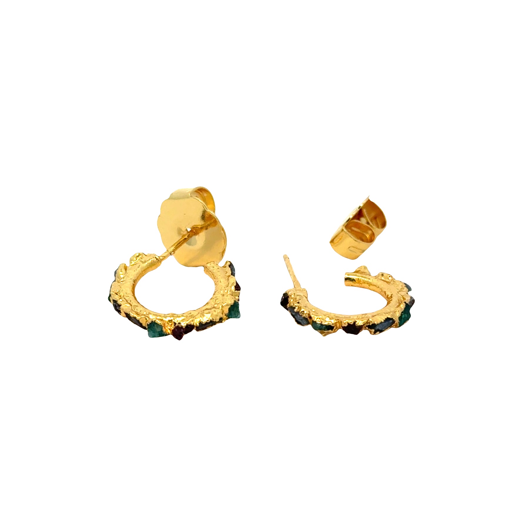 Like tiny fragments of nature trapped in gold, these earrings capture the magic of imperfection. Each pair is carefully handmade in Colombia in bronze with 24k gold plating, sealed with a protective lacquer to preserve its shine. The stars: raw emeralds, rubies, and sapphires, set as if the earth itself had dropped them that way—unpolished, unfiltered.
