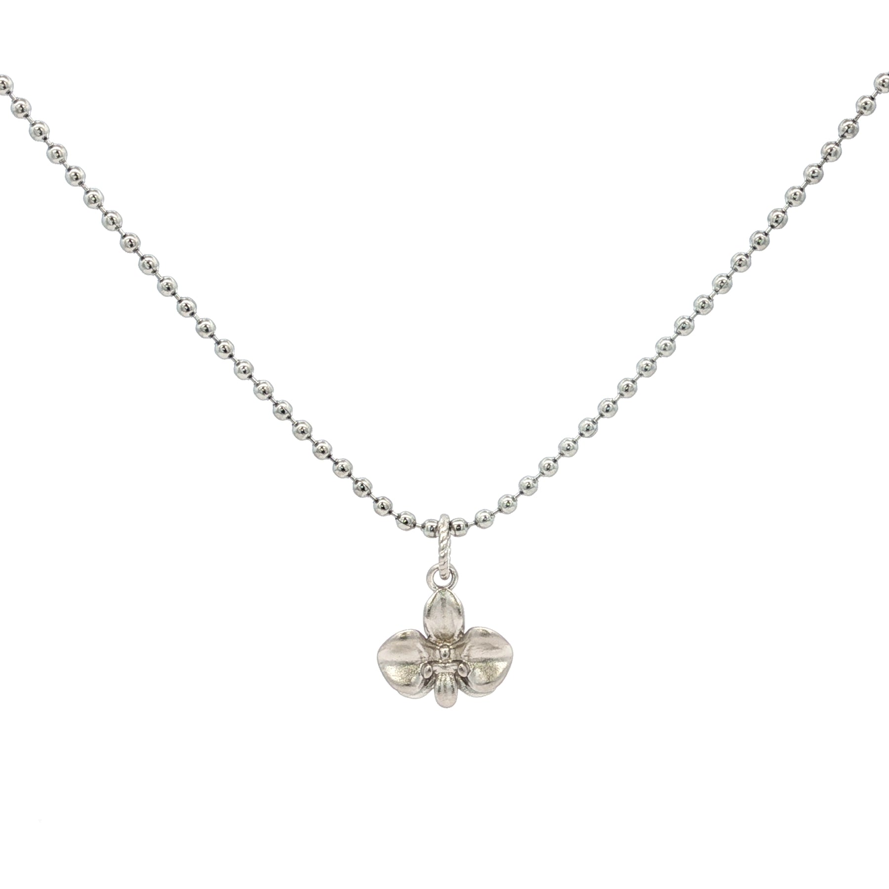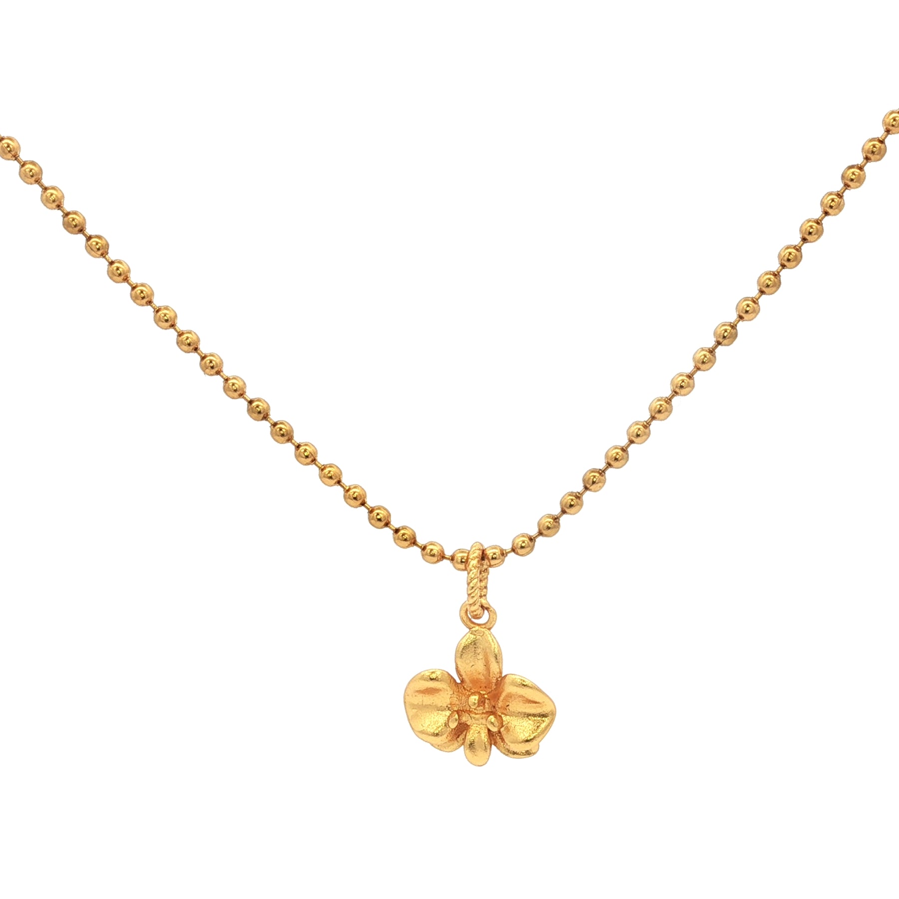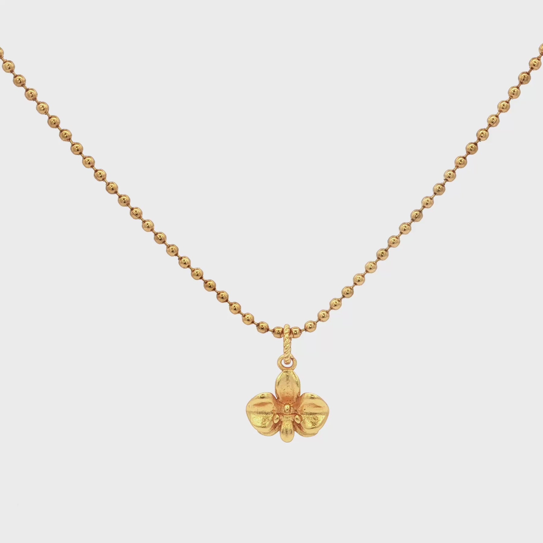 Crafted in bronze with 24k gold plating or silver-plated, its orchid-shaped pendant celebrates the perfect imperfection of nature and turns a symbol of roots and femininity into an everlasting talisman.